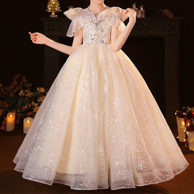 キッズ ドレス オフショルダー チュール フレア プリンセス スパンコール 半袖 ロング丈 ピアノ 発表会 子ども服 女の子 フォーマル フェミニン シャンパンカラー ホワイト 110 120 130 140 150 160cm