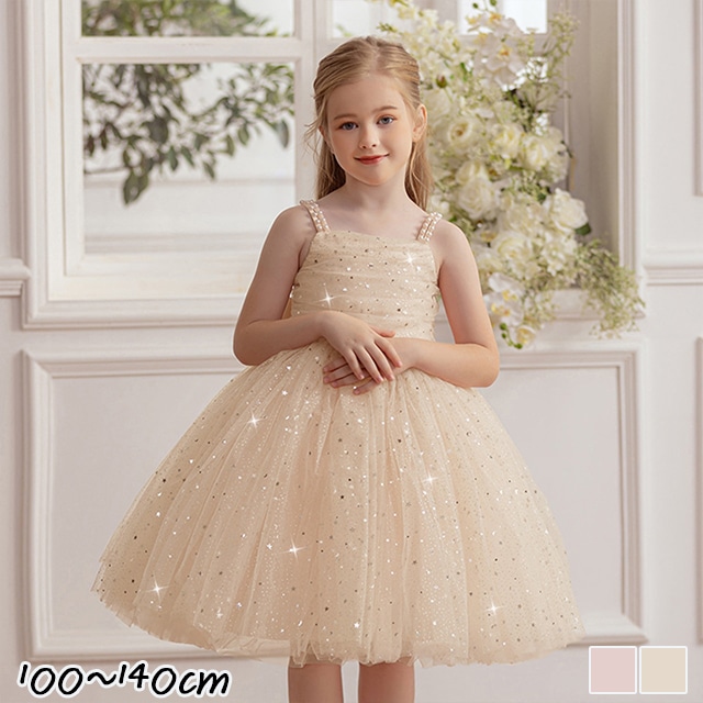 キッズ ドレス ノースリーブ チュール フレア プリンセス パール リボン スパンコール ピアノ 発表会 子ども服 女の子 フォーマル フェミニン ベージュ ピンク 100 110 120 130 140cm