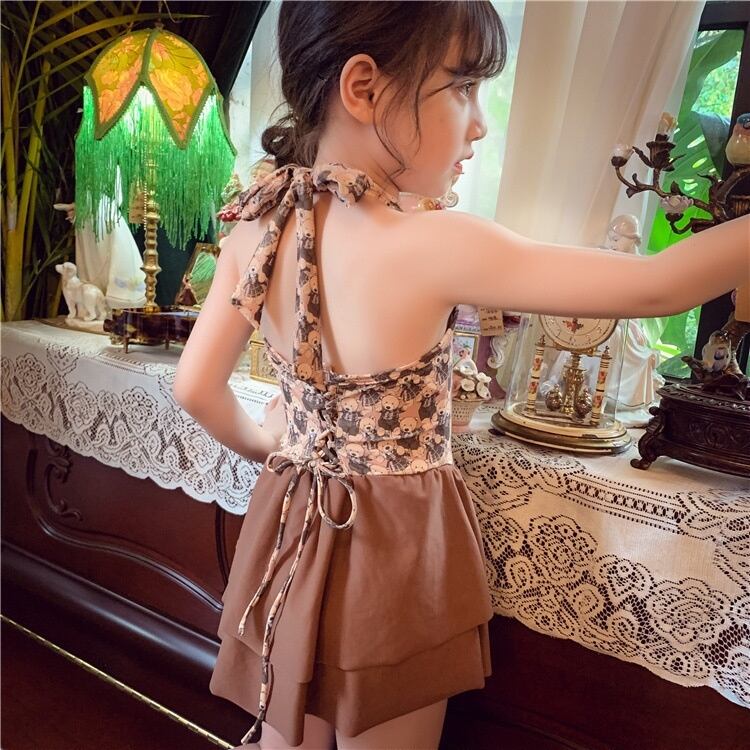 くまさんモチーフがとってもキュート♪ ホルターネック×リボンがポイントのワンピース水着。