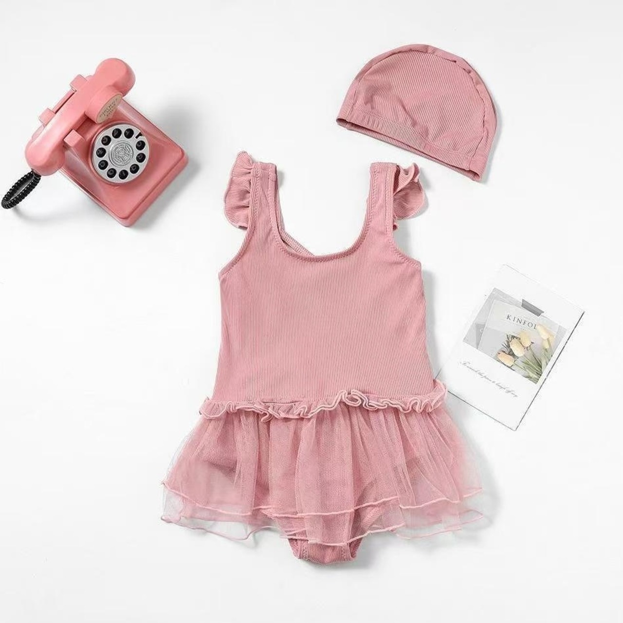 ふんわりチュールが可愛い♪ リボン×フリルがポイントのワンピース水着。