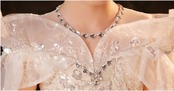 チュールがふんわり広がるフレアシルエットに肩を優しく見せるオフショルダー風デザイン。