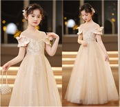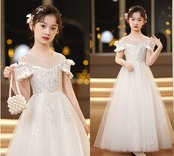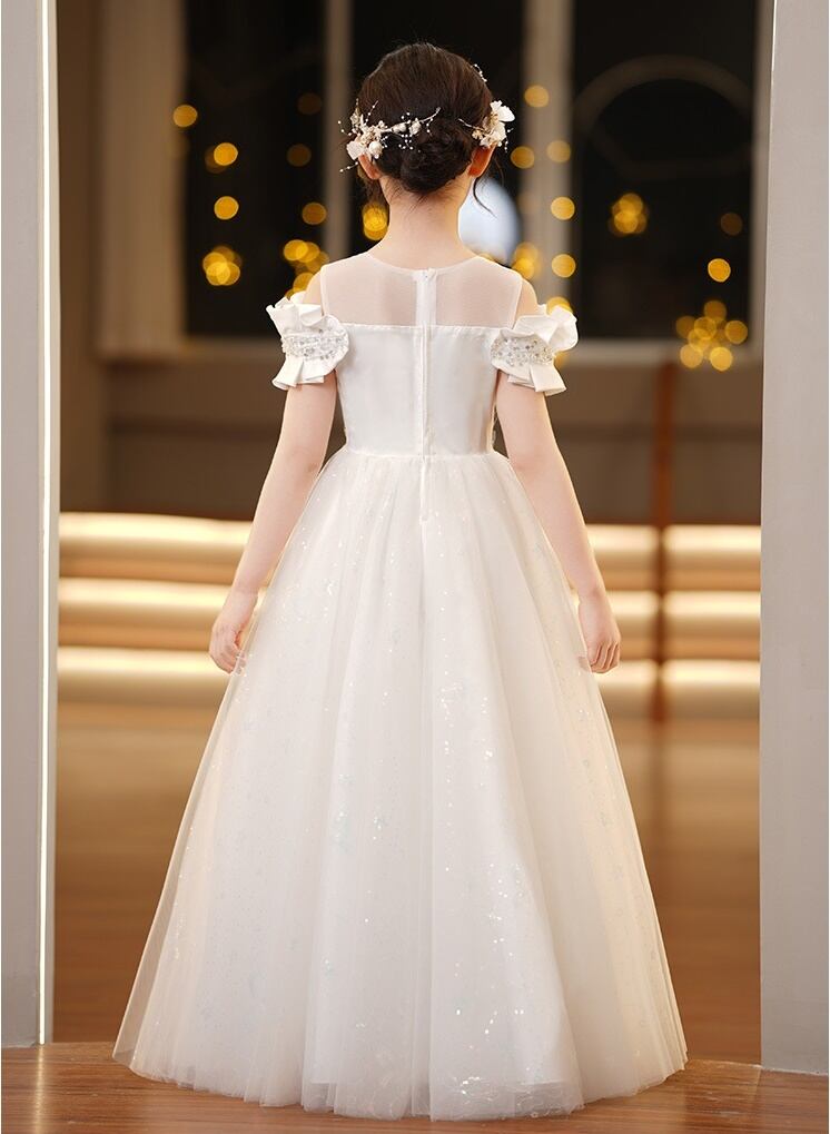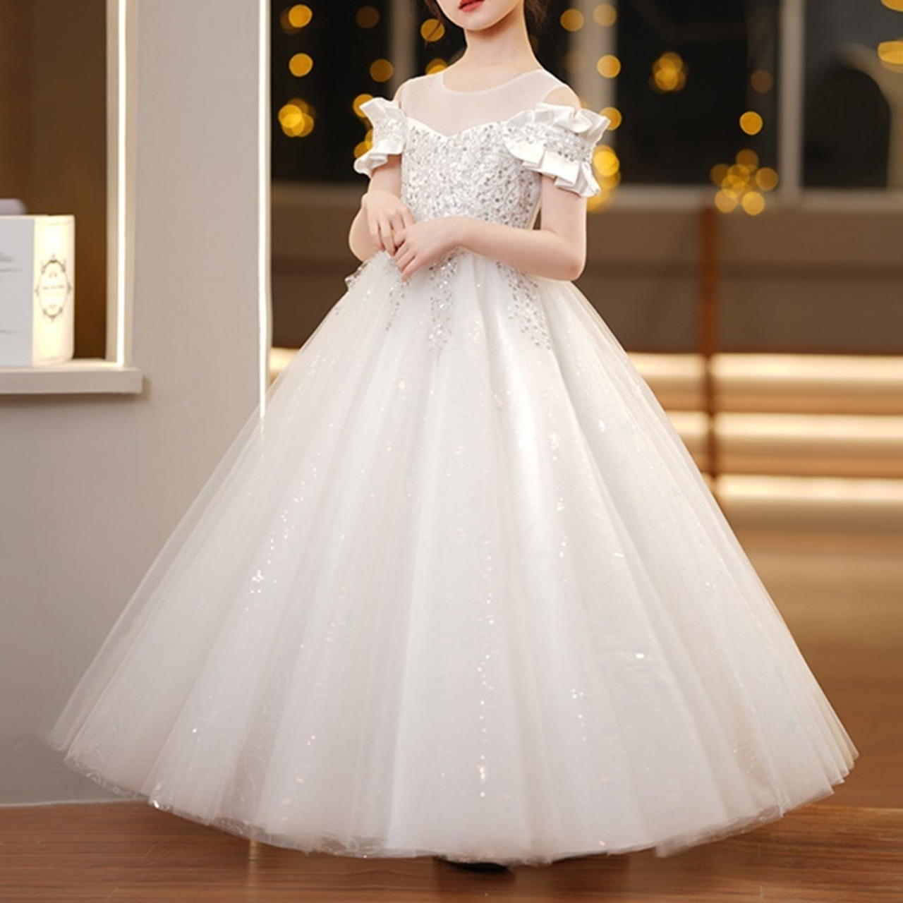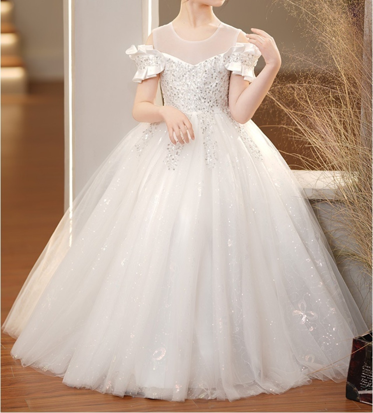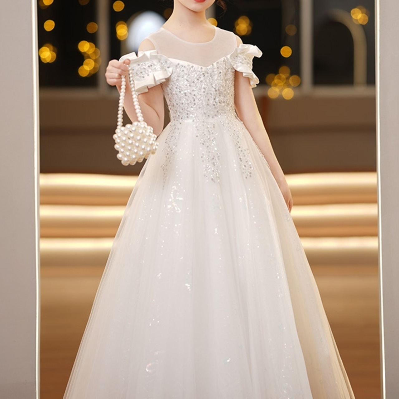 ロング丈のプリンセスドレスは、動くたびに優雅に揺れて、どこから見ても存在感たっぷり。