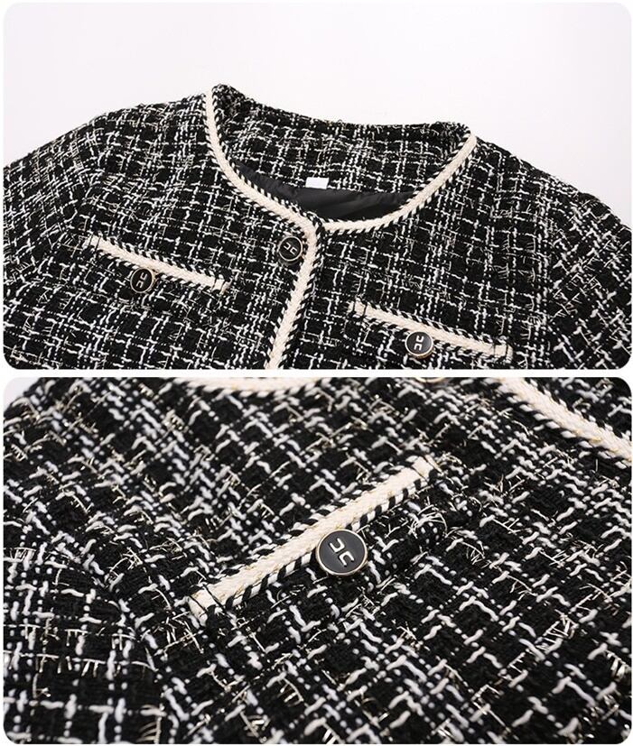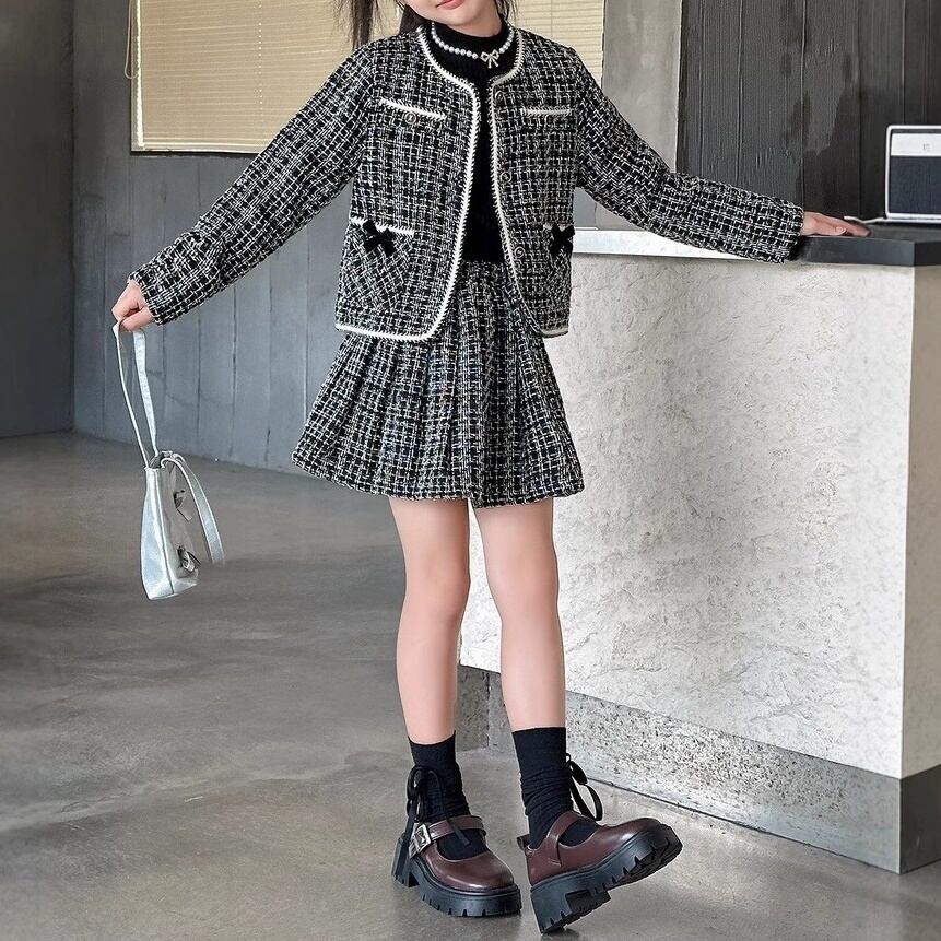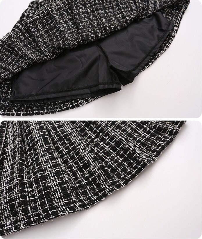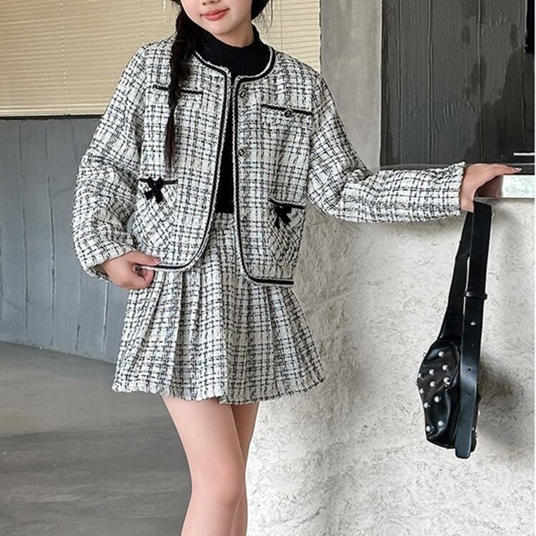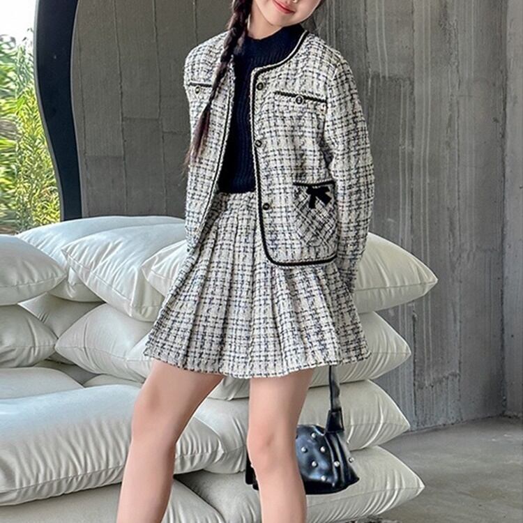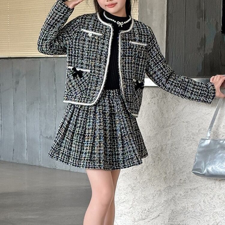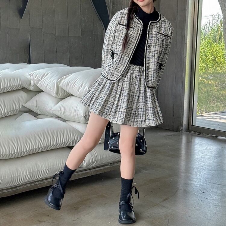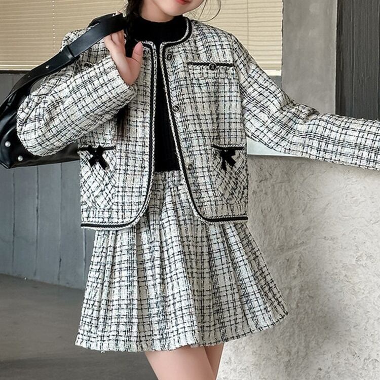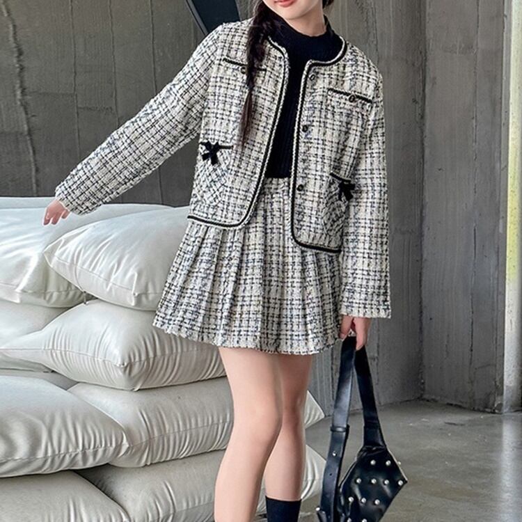 チェック柄の上品なジャケットと動きやすいミニスカートのツーピースセットで、フォーマル感とおしゃれさのバランスが絶妙!