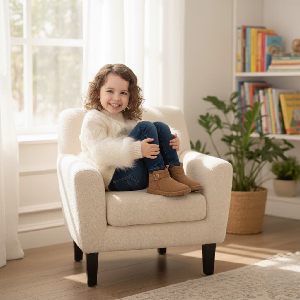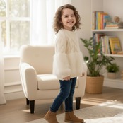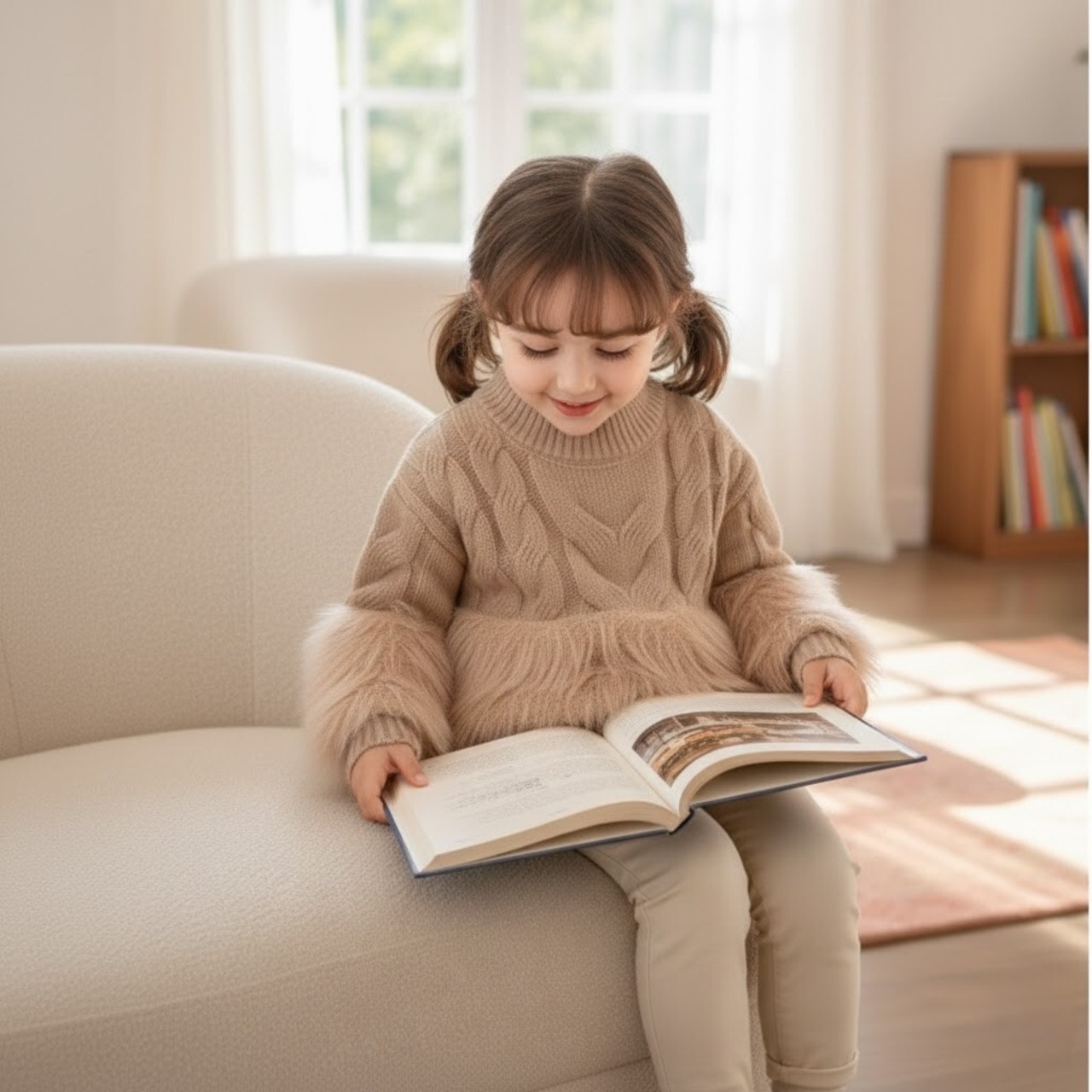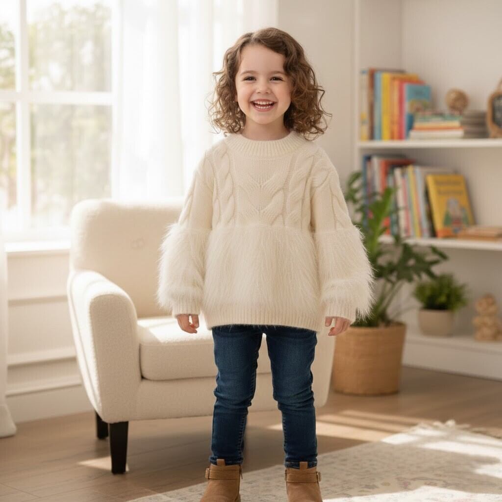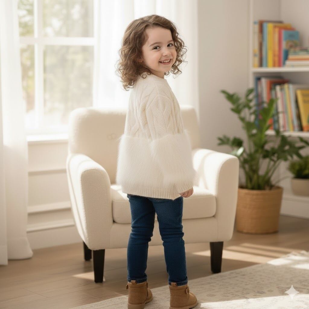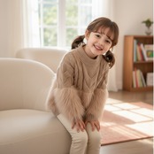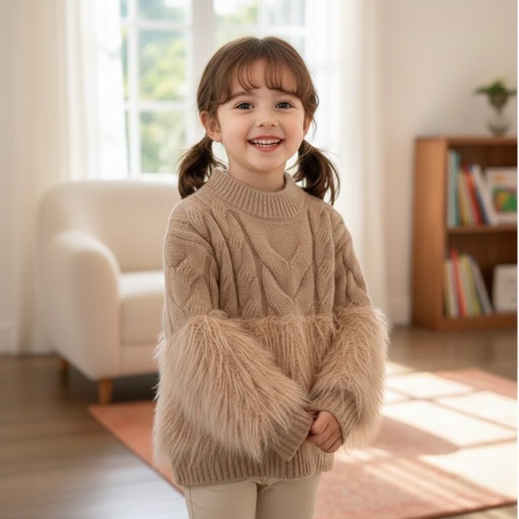 やさしいブラウンとオフホワイトのナチュラルカラーが、上品で可愛らしい印象を演出します。シンプルながらも存在感のあるデザインで、女の子らしさを引き立てる一枚です。