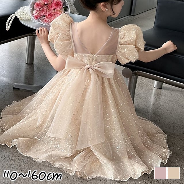女の子らしさを引き立てるパフスリーブと、大きめのバックリボンがポイントのドレス。ふんわりと広がるシルエットが華やかで、発表会やフォーマルシーンにぴったりです。