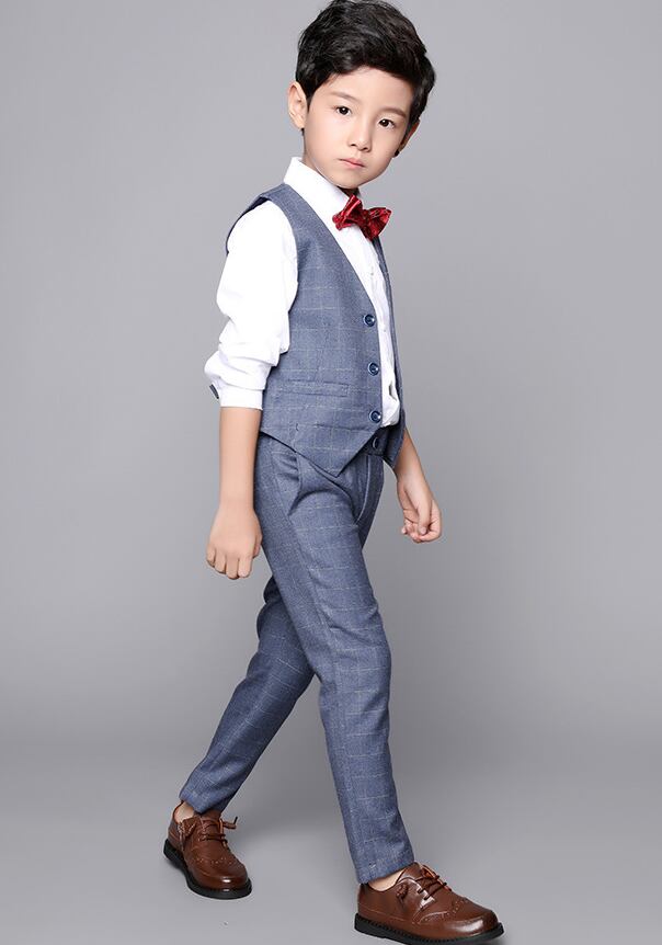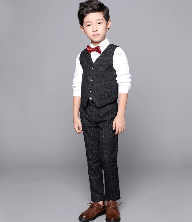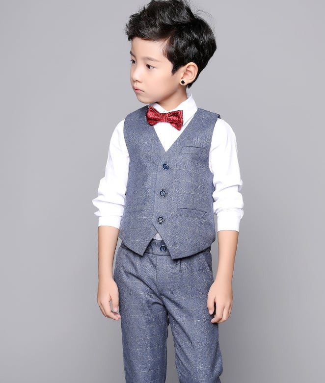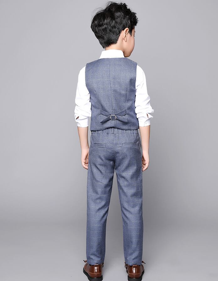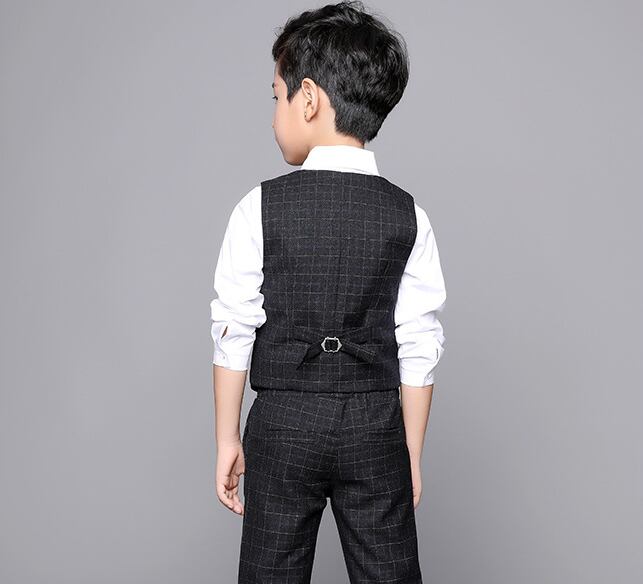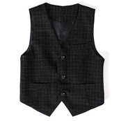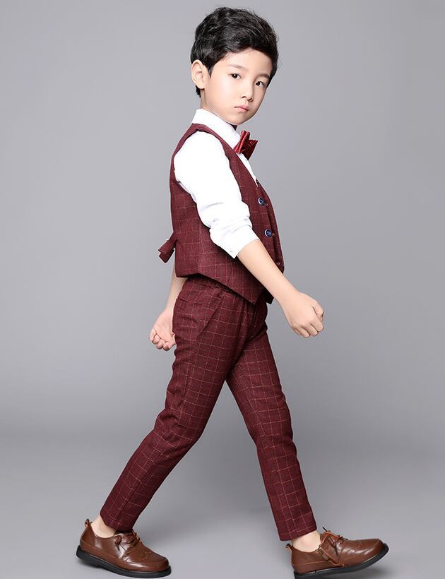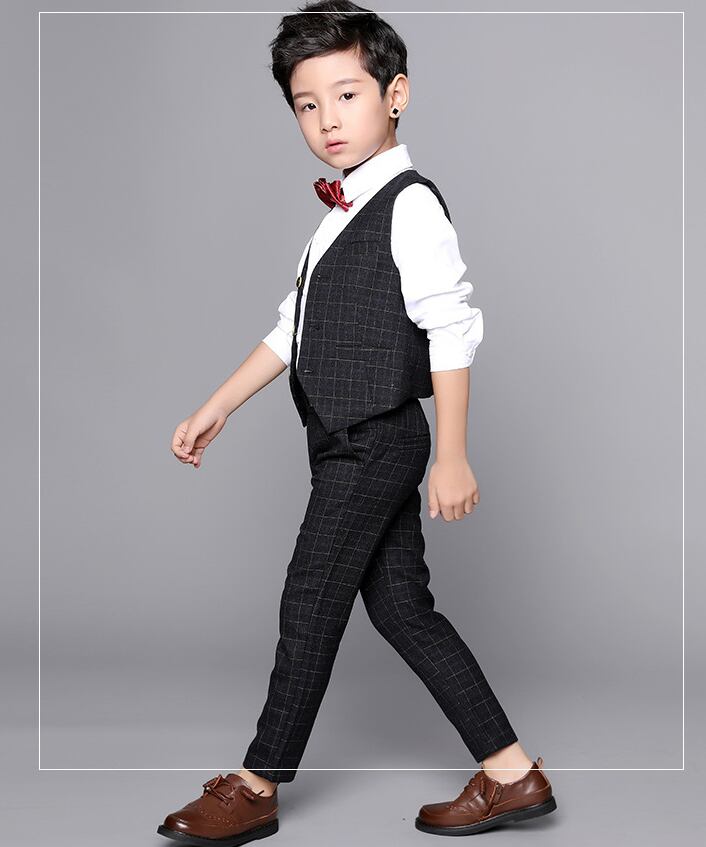 チェック柄のベストとパンツが上品で、シンプルながらも洗練された印象に仕上げてくれる一着です。アクセントの蝶ネクタイがコーディネートを引き締め、ぐっとおしゃれな雰囲気を演出。