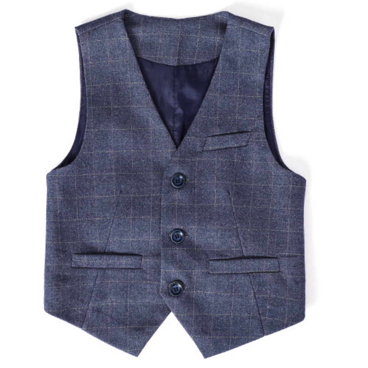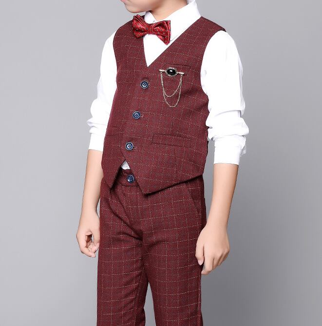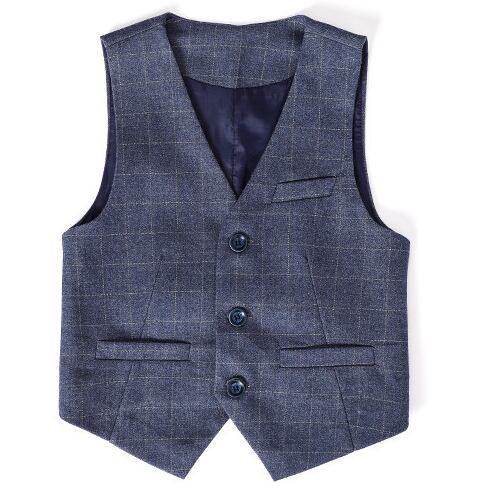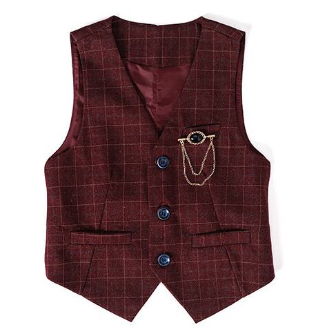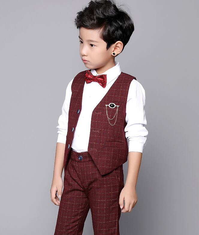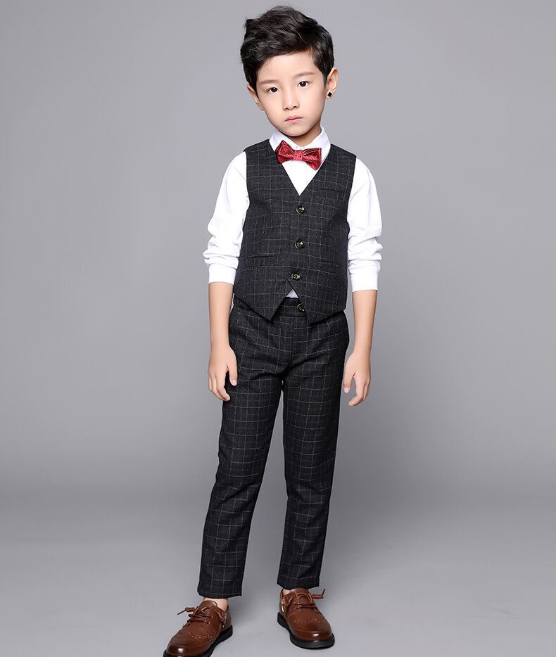 チェック柄のベストとパンツが上品で、シンプルながらも洗練された印象に仕上げてくれる一着です。アクセントの蝶ネクタイがコーディネートを引き締め、ぐっとおしゃれな雰囲気を演出。