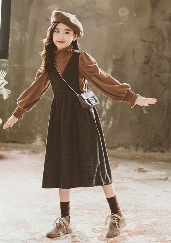 ふんわりとしたフェミニンなデザインが魅力のキッズ用ハイネックトップスとチェック柄ワンピースのセット!女の子のおしゃれを引き立てるアイテムです☆