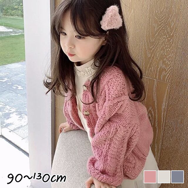 ナチュラルなベージュ・ピンク・グレーの3色展開で、どんなアイテムとも合わせやすく、カジュアルにもきれいめにも着こなせます。前開きボタンで着脱しやすく、軽やかなニット素材は季節の変わり目に大活躍♪