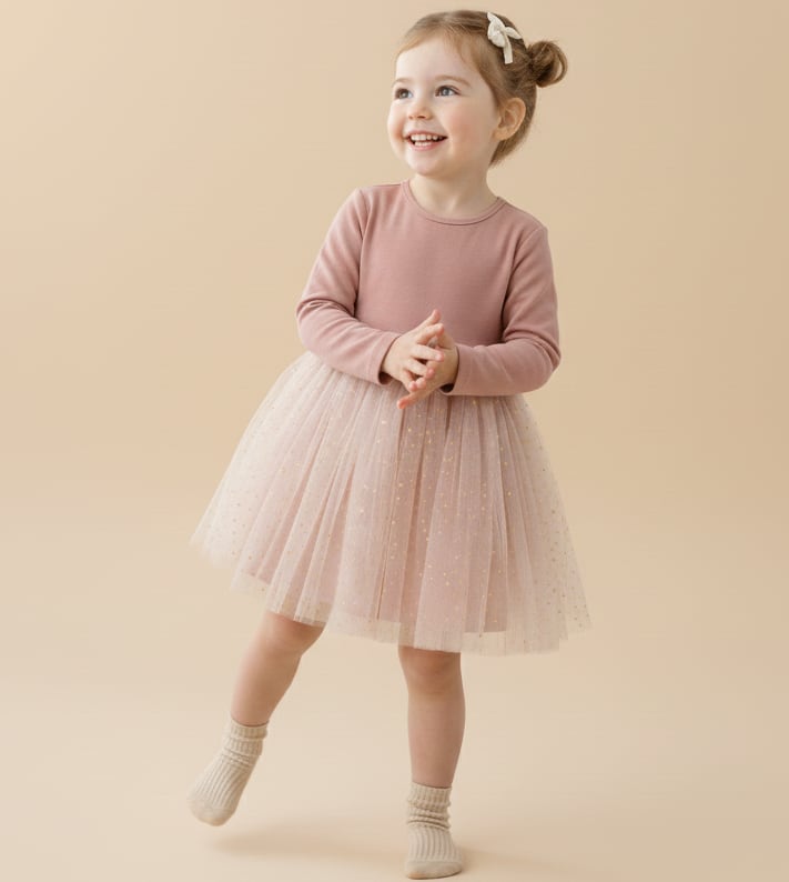 ラメ入りの星柄チュールがキラキラ輝く、ベビー用ワンピース。フリルやふんわり広がるチュールスカートが女の子らしさ満点で、写真映えもバッチリです♪