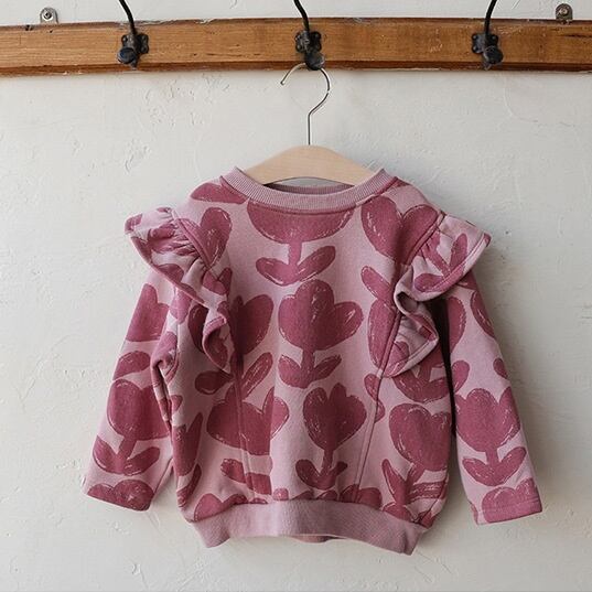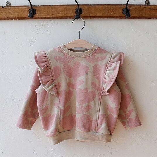 フリルショルダーと花柄が魅力の、ナチュラルフェミニンなベビー&キッズ用スウェットトップスです。