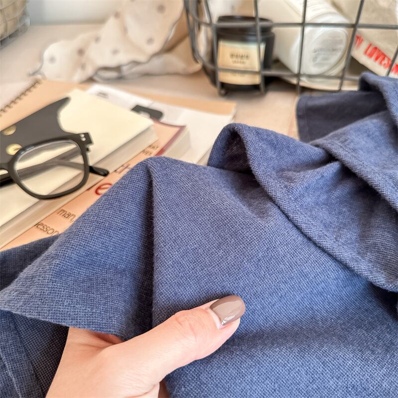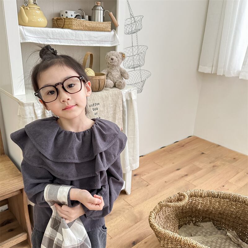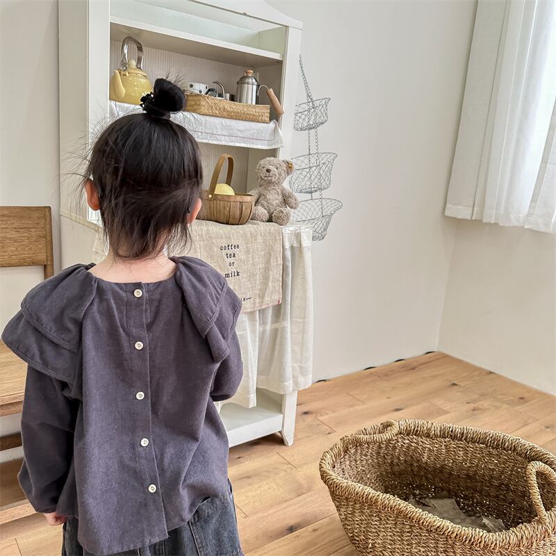 フリルとバックのボタンが可愛らしい、女の子のためのワイドシャツ☆ ブルーとグレーのナチュラルなカラーが、マニッシュな魅力をしっかりと引き立てます。