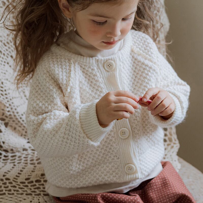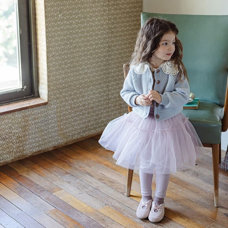どんなコーデにも合わせやすい、シンプルでフェミニンなデザインが魅力のキッズ&ベビーカーディガン。ナチュラルなブルーとベージュの2色展開で、やさしい色味が女の子らしさを引き立てます。